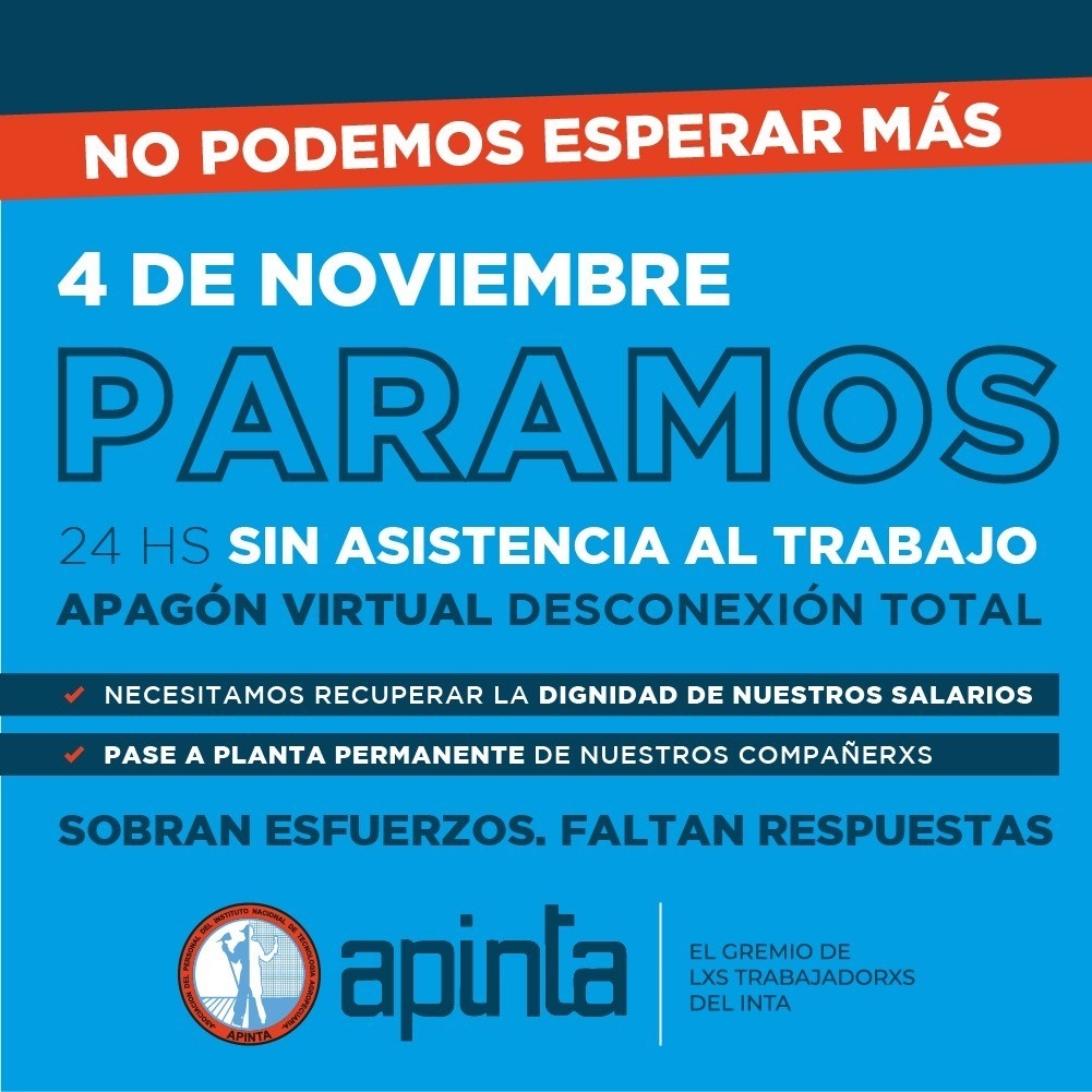 A fines de septiembre se conoció el acuerdo de la paritaria nacional para la administración pública, con un irrisorio 7% de aumento a partir de octubre. Este porcentaje, además de generar mucha disconformidad en todxs lxs trabajadorxs del INTA, provocó la reacción del secretariado nacional de APINTA que inmediatamente convocó a un Congreso Extraordinario para mediados de octubre, donde se decidió el paro de actividades que ahora se concreta.