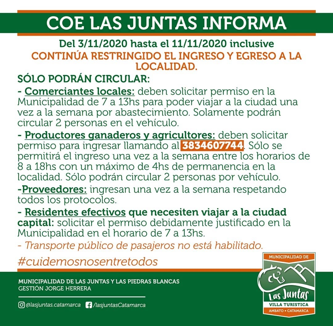 🔶Productores ganaderos y agricultores: deben solicitar permiso para ingresar llamando al 3834607744. Sólo se permitirá el ingreso una vez a la semana entre los horarios de 8 a 18hs con un máximo de 4hs de permanencia en la localidad. Sólo podrán circular 2 personas por vehículo.