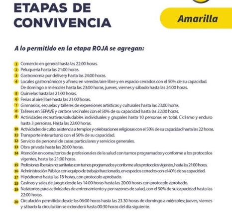 4-Locales gastronómicos y afines: en veredas/aire libre y en espacio cerrados con el 50% de su capacidad. De domingo a miércoles hasta las 23:00 horas; jueves, viernes y sábado hasta las 24:00 horas.