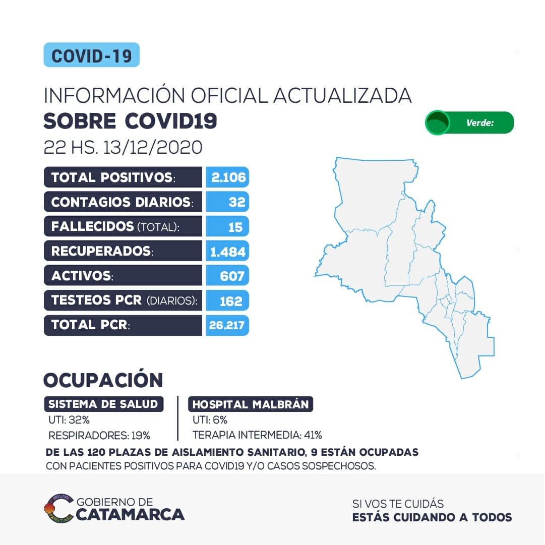Hasta las 22 horas del domingo 13 de diciembre, se han detectado 32 nuevos casos positivos de coronavirus en la provincia de Catamarca. El total acumulado de casos positivos detectados asciende a 2106.