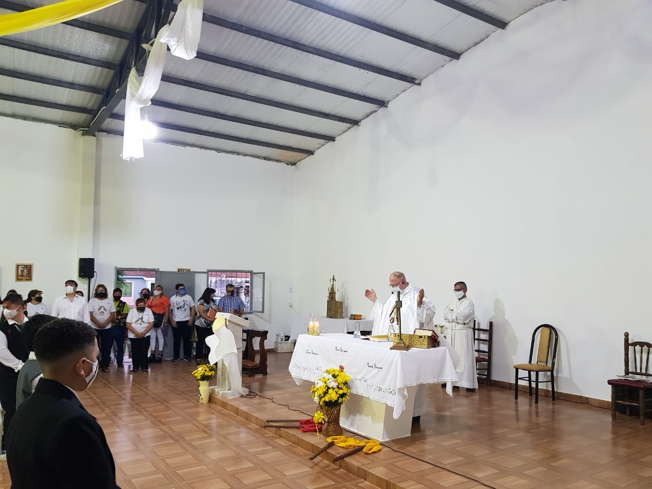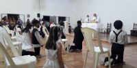 La fiesta contó con la presencia del Obispo Diocesano, Mons. Luis Urbanc, quien presidió la Santa Misa, concelebrada por el párroco, Pbro. Héctor Salas, en la que alrededor de 45 niñas y niños del sector recibieron por primera vez a Jesús Sacramentado.
