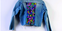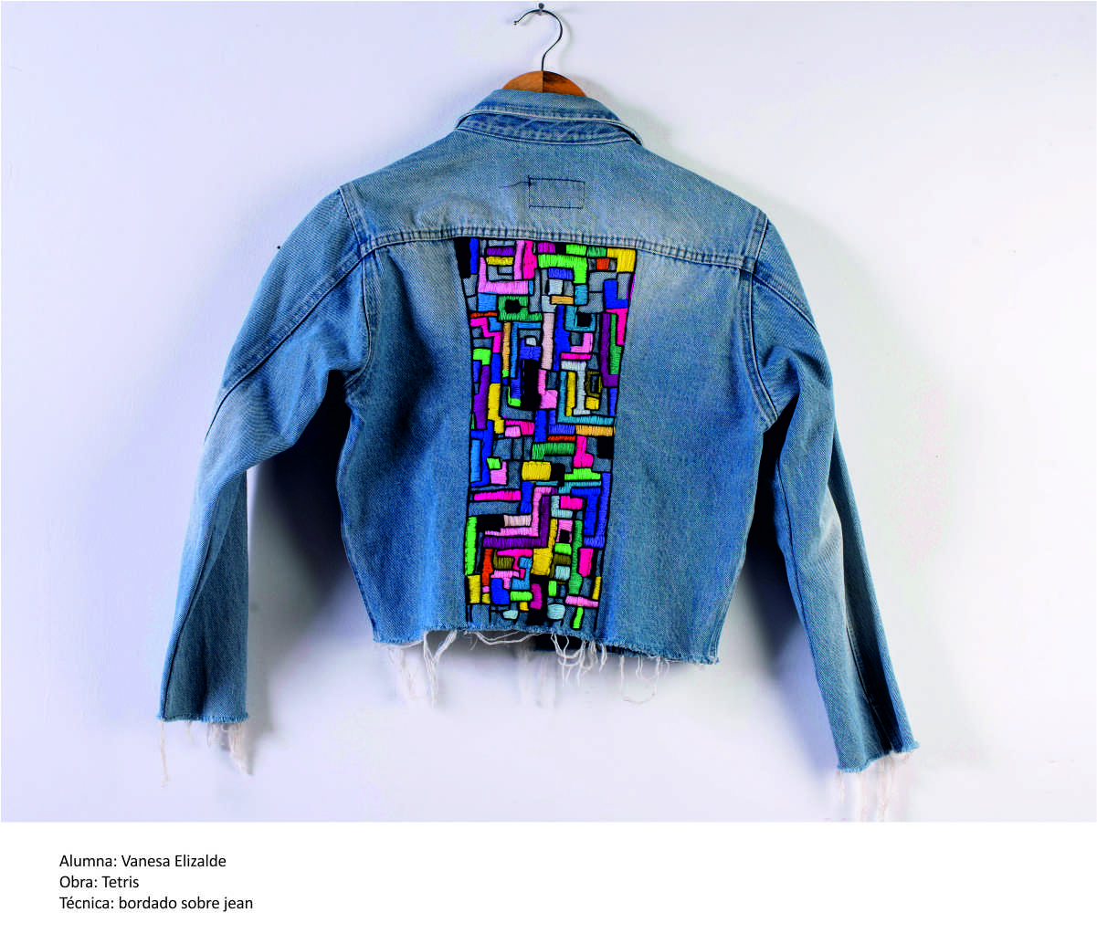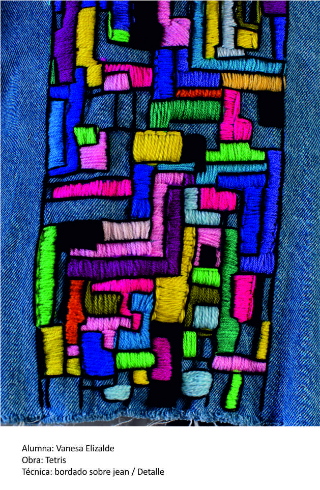 Propone bordados libres y desestructurados en composiciones geométricas, pequeños módulos en repetición sobre diversas bases textiles -acrocel, jean, lana- . Puntadas a mano como pinceladas de un óleo, con hilos de algodón, seda, lana, interviniendo y tematizando en prendas de uso cotidiano. Tejidos a ganchillo.