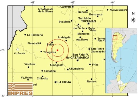 Epicentro: 110 km al NO de San F. Del Valle De Catamarca; 156 km al N de La Rioja; 48 km al SE de Belén -28.009 (lat) -66.748 (long)