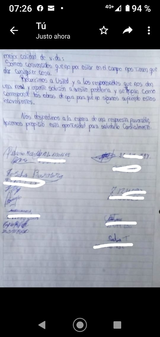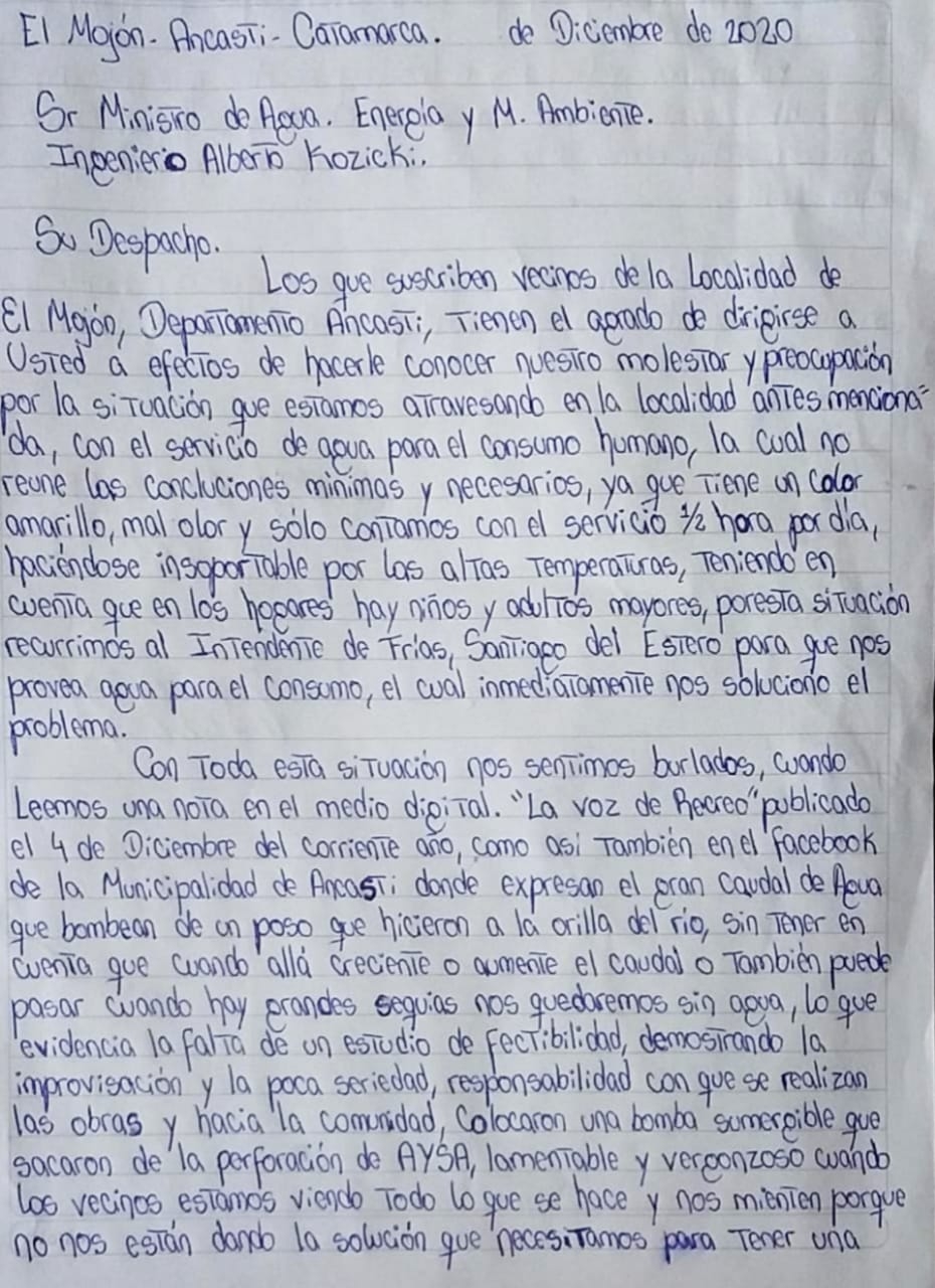 Los vecinos comentaron que "la obra del municipio de Ancasti es de mala calidad, sin ningún estudio serio, el agua es amarilla sin ningún tipo de tratamiento. Hicieron un pozo de 3 metros a la orilla del río, nada más. Hay veces que encontramos hasta animales muertos en el lugar".