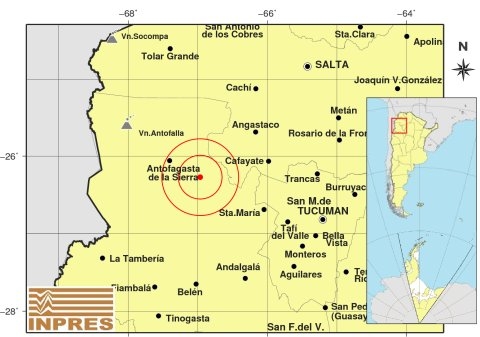Epicentro: 186 km al O de San Miguel De Tucumán; 224 km al SO de Salta; 50 km al SE de Antofagasta De La Sierra -26.274 (lat) -66.965 (long)