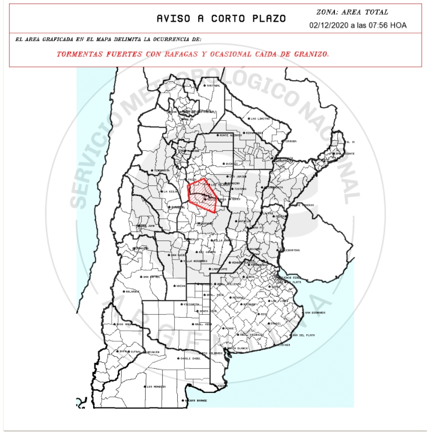 AVISO A CORTO PLAZO POR TORMENTAS FUERTES CON RAFAGAS Y OCASIONAL CAIDA DE GRANIZO.