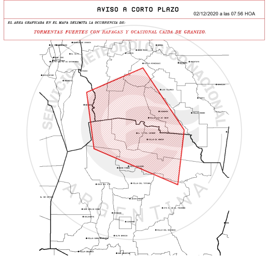 Para la mañana de hoy afectando: Zona serrana de Pomán - Paclín - Ambato - Capayán - Capital - Santa Rosa - Valle Viejo - Ancasti - El Alto - La Paz - Fray Mamerto Esquiú.