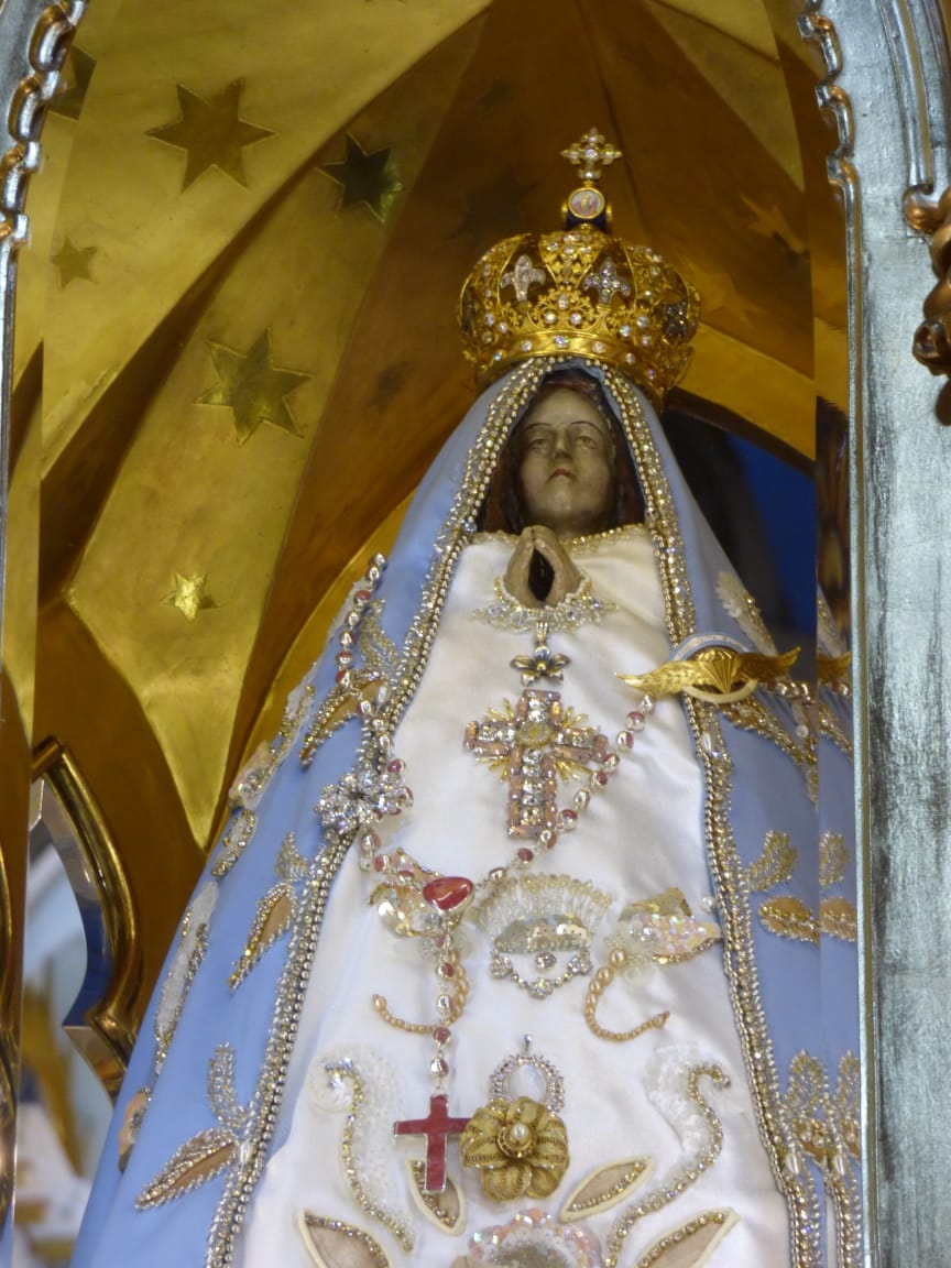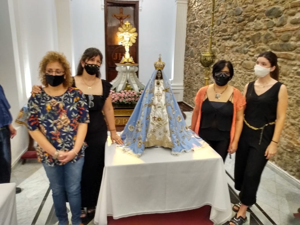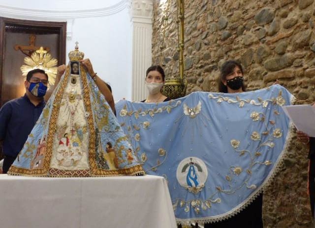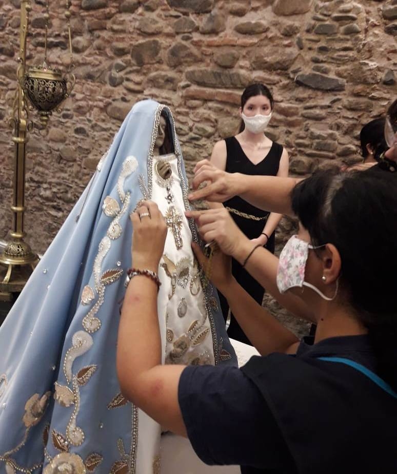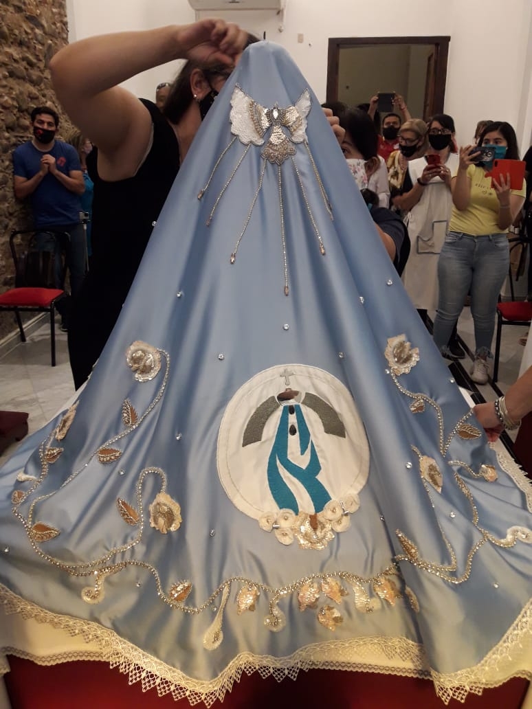 Durante una ceremonia íntima, llevada a cabo en la Capilla del Santísimo Sacramento, la Sagrada Imagen fue vestida con este manto bordado afanosamente. Este momento especial fue presidido por el Rector del Santuario y Catedral Basílica, Pbro. Gustavo Flores, con la participación de Fabiana Silva, Gabriela Calvimonte (diseñadora), Fabiana Insfrán y Candela Salas, en representación de tantas personas que se sumaron a esta propuesta de la Comisión de Cultural del Año Mariano Nacional.