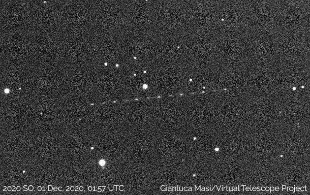 "En este mismo momento #2020SO está teniendo su vuelo seguro con nuestro planeta, a unos 50000 km de nosotros. Aquí hay una imagen que hicimos anoche: mira cómo cambia su brillo regularmente, mientras este objeto (el amplificador de Surveyor 2) gira. El objeto es el rastro punteado que ves allí", informó el proyecto Virtual Telescope en su cuenta de Twitter.