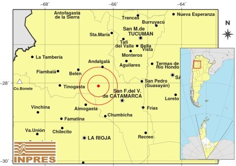 Epicentro: 80 km al NO de San F. Del Valle De Catamarca; 153 km al N de La Rioja; 56 km al S de Andalgalá -28.075 (lat) -66.436 (long)
