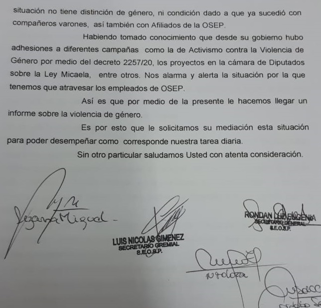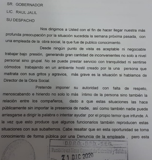 La nota dirigida al Gobernador Jalil se produce tras conocerse públicamente una denuncia por supuesto maltrato realizada por una empleada del organismo en contra del director.