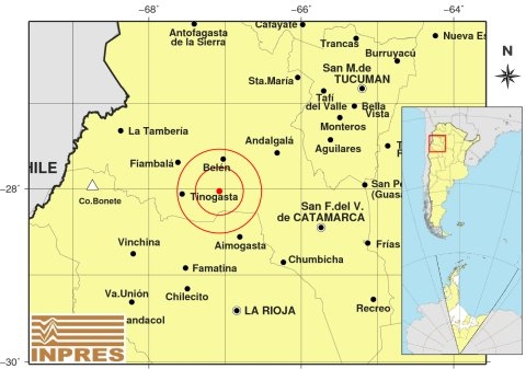 Epicentro: 139 km al O de San F. Del Valle De Catamarca; 155 km al N de La Rioja; 42 km al S de Belén -28.028 (lat) -67.075 (long)