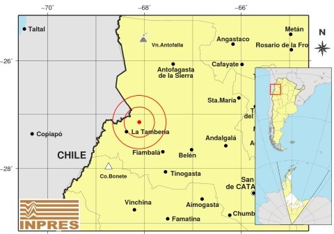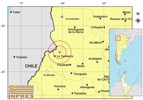 Epicentro: 274 km al NO de San F. Del Valle De Catamarca; 280 km al NO de La Rioja; 33 km al NE de La Tambería -27.143 (lat) -68.105 (long)