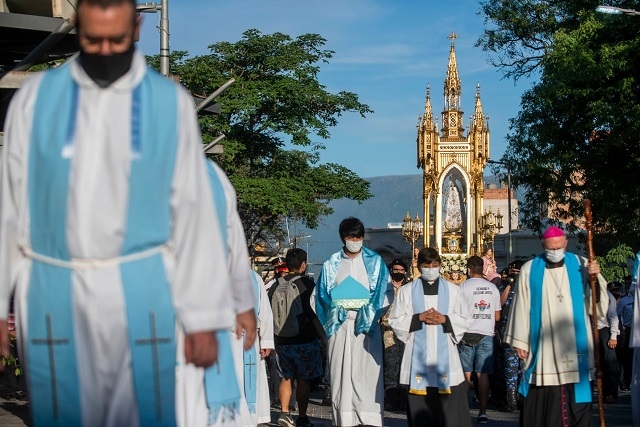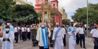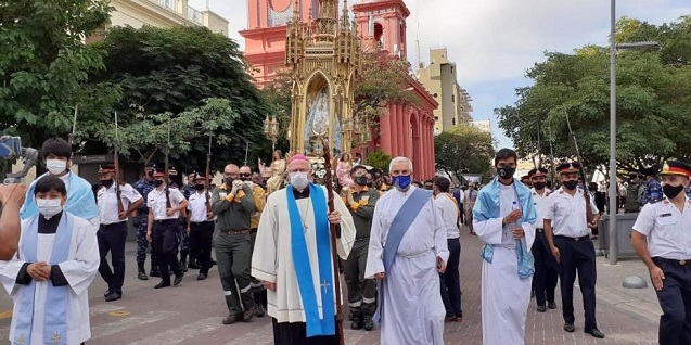 Junto al Obispo Diocesano marchó un puñado de sacerdotes del clero diocesano, entre ellos el Vicario General, Pbro. Julio Murúa, y el Rector del Santuario y Catedral Basílica, Pbro. Gustavo Flores; de la comunidad franciscana y de Fasta, diácono y seminaristas.