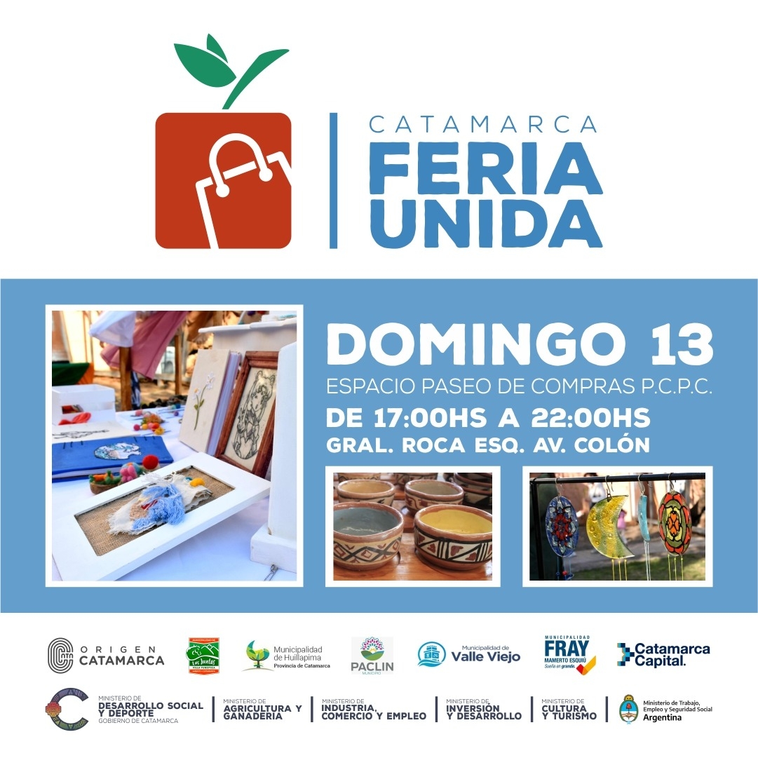 La Feria Unida es promovida por el Gobierno de Catamarca, a través de los Ministerios de Cultura y Turismo, Desarrollo Social y Deportes, Agricultura y Ganadería, el de Industria, Comercio y Empleo y el de Inversión y Desarrollo, y el Ministerio de Trabajo, Empleo y Seguridad Social de la Nación, a los que se suman los municipios de Catamarca Capital, Fray Mamerto Esquiú, Valle Viejo, Huillapima, Las Juntas y Paclín, con la intención de impulsar la reactivación de la economía social.