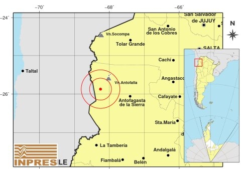 Epicentro: 308 km al O de Salta; 322 km al O de San Miguel De Tucumán; 88 km al O de Antofagasta De La Sierra -25.873 (lat) -68.253 (long)
