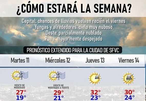 Hoy, lunes 10, el viento noreste se ha restablecido en la capital catamarqueña. Condiciones similares se extenderán hasta el miércoles, con un leve ascenso de las temperaturas. Hasta ese día habrá nubosidad variable, pero con muy bajas chances de precipitaciones en la ciudad y el Valle Central.