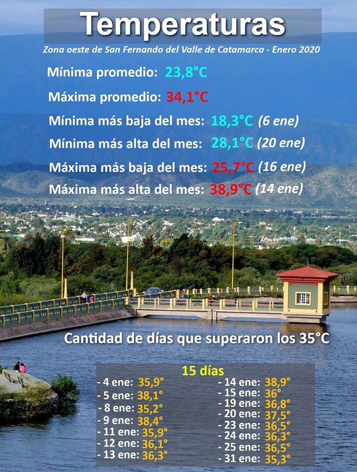 La ciudad de San Fernando del Valle de Catamarca, al estar enclavada en un gran valle a baja altitud, las temperaturas siempre serán mayores. Aún así, en este enero no alcanzamos los 40° en ningún día, pues como ven, la temperatura más alta registrada fue de 38,9°C en la zona oeste y 39,1° en la zona este. Lo que sí se puede destacar, es que el promedio mensual, tanto de mínimas como de máximas, ha sido superior a enero del año pasado. En 2019, el promedio de mínimas fue de 20,8°, mientras que el promedio de este enero de este año fue de 23,8°. Por su parte, el promedio de las máximas en enero 2019 fue de 33° y en enero último fue de 34,1°.