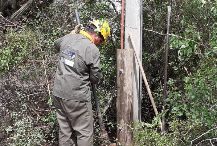 En un trabajo conjunto, personal de la Municipalidad de Saujil ayudaron a mover las piedras del río y el monte para desenredar los cables cortados de la línea de Media Tensión de 13,2 kv afectada por la tormenta, para que los operarios pueden ir parando los postes caídos a mano, ya que es imposible entrar con grúa.