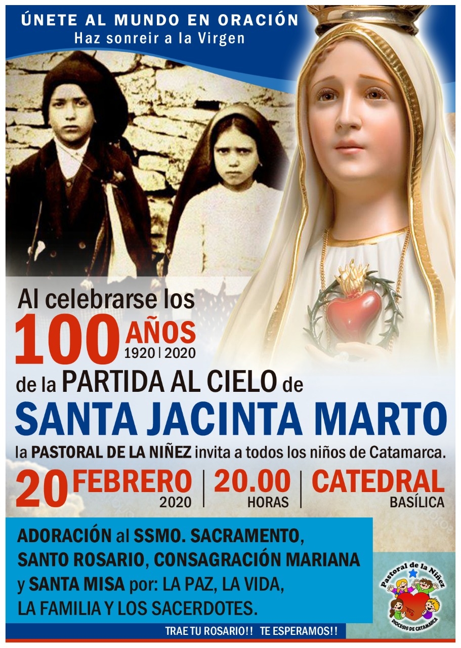 Al conmemorarse el centenario de la partida al Cielo de Santa Jacinta Marto, una de las pastorcitas a quienes se les apareció la Virgen de Fátima, la Pastoral de la Niñez invita a todos los niños a participar de las actividades previstas con ocasión de este acontecimiento.