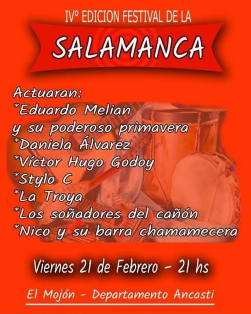 En Ancasti, hoy viernes, a partir de las 21 horas, en El Mojón, departamento Ancasti, se llevará a cabo la IV edición del Festival de la Salamanca.