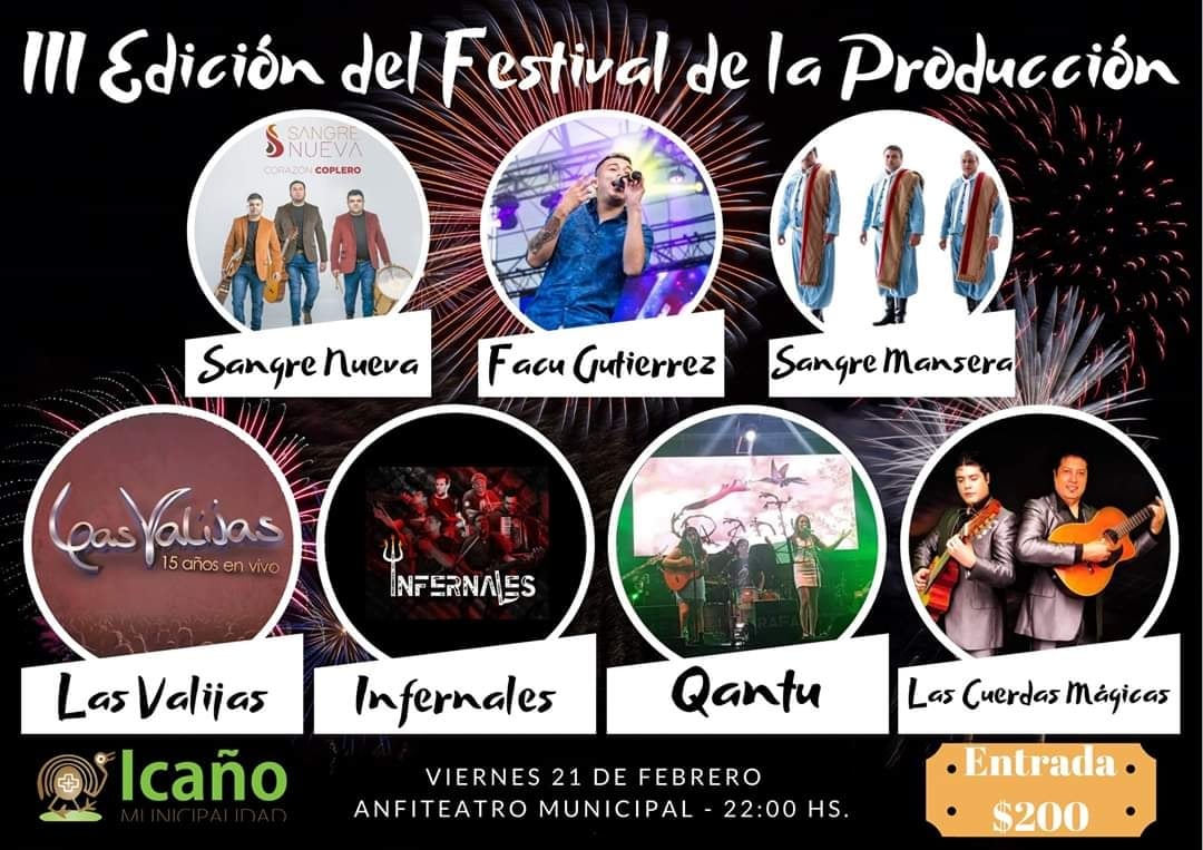 En tanto que en el anfiteatro municipal de Icaño, se desarrollará la 3° edición del Festival de la Producción, con una entrada al valor de 200 pesos.