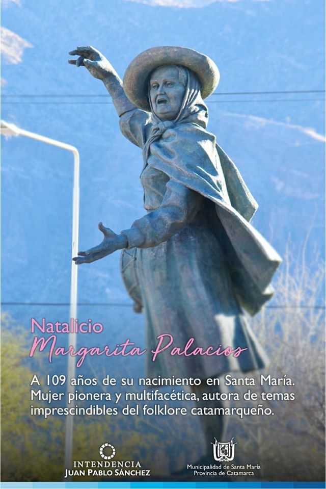 Margarita Palacios nació en Santa María, Catamarca, el 22 de febrero de 1911. Fue compositora y cantante, también se dedicó a la gastronomía, fue recopiladora de recetas de platos tradicionales del país, y de coplas del noroeste argentino.