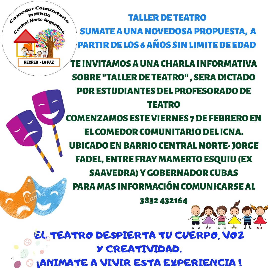 Este viernes, lanzarán esta nueva propuesta a puro teatro. Desde los 6 años y sin límite de edad. El taller estará a cargo de los alumnos de la Tecnicatura en Teatro del IES Recreo: Lucas Maidana, Natalia Pérez Díaz, Fabián Díaz y Micaela Córdoba.