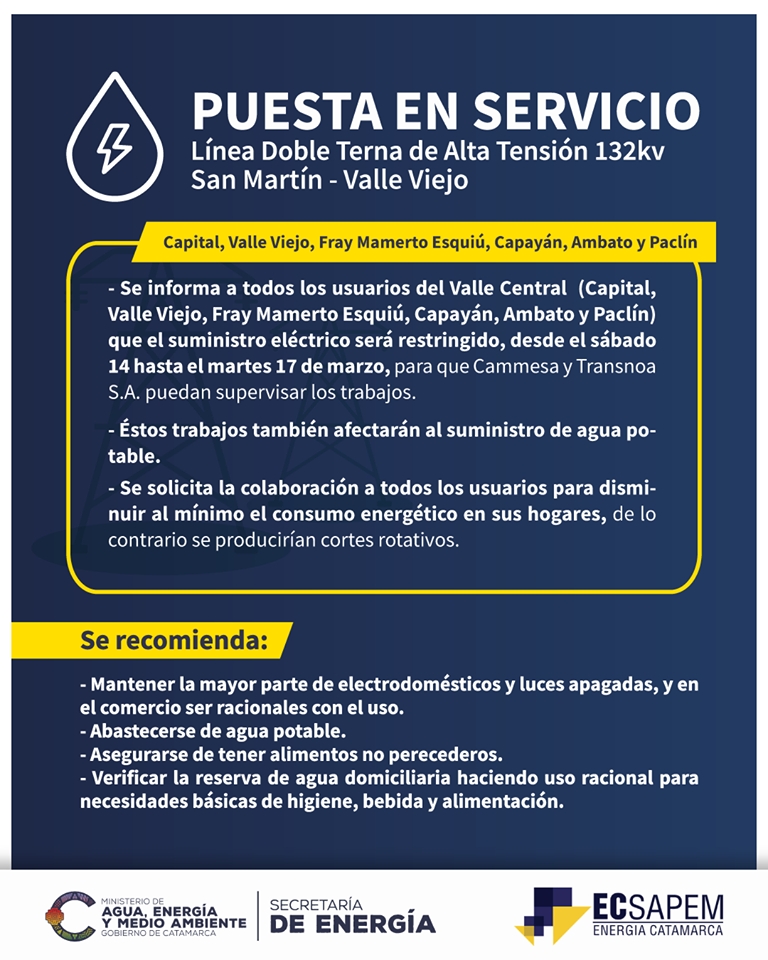 Es por las maniobras de la obra “Línea de Alta Tensión 132 kv Doble Terna San Martín – Valle Viejo”, que brindarán mayor seguridad y versatilidad al sistema energético.