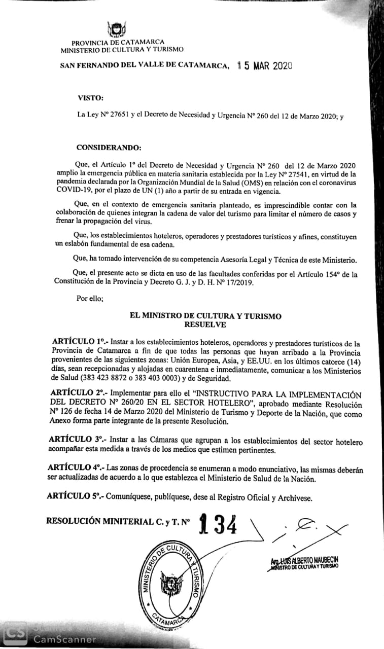 Así lo establece una resolución del Ministerio de Cultura y Turismo de la Provincia que, además, insta a los hoteleros y prestadores turísticos a que, en caso de recibir turistas extranjeros que hayan ingresado al país en los últimos 14 días, deberán alojarlos en cuarentena y dar inmediato aviso a los Ministerios de Salud y de Seguridad de la Provincia, comunicándose al 383 - 4238872 o 383 – 4030003.