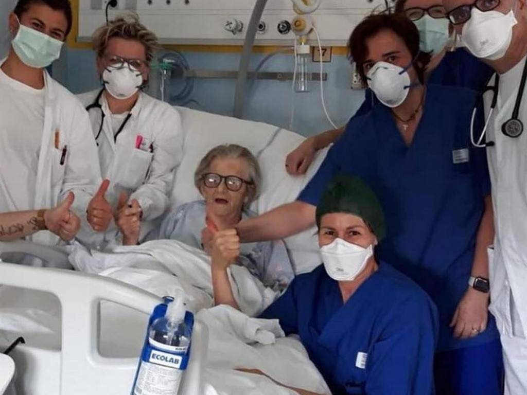 Pese a que Italia suma 651 muertos el dia de hoy y la cifra de fallecidos asciende a 5.476 personas hay un motivo para festejar. Ese motivo se llama Alma Clara Corsini, considerada simbolo de la resistencia contra el COVID-19 en el mundo. La anciana se recupero del coronavirus y festeja junto al equipo medico.