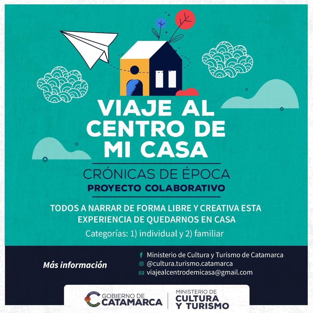 Tomando en cuenta esta etapa, el Ministerio de Cultura y Turismo de Catamarca invita a los catamarqueños a participar de “Viaje al interior de mi casa”, un proyecto colaborativo que procura generar una memoria de esta época tan particular que atraviesa el mundo, a partir de crónicas que cada uno escriba sobre sus días en casa, de forma libre y creativa.