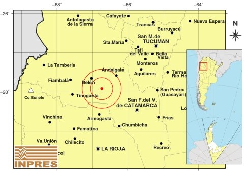 Epicentro: 114 km al NO de San F. Del Valle De Catamarca; 166 km al N de La Rioja; 41 km al SE de Belén -27.914 (lat) -66.733 (long)