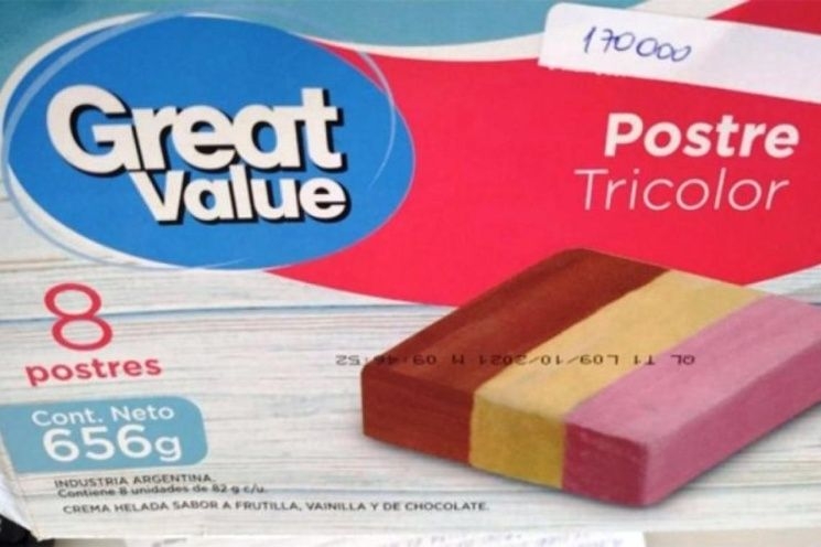 La ANMAT (disposición 2012/2020) también prohibió la venta en todo el país de la “Crema helada sabor frutilla, vainilla y chocolate – Postre Tricolor” de ocho porciones de la marca Great Value. Los lotes afectados son el “QLT1 L” con fecha de vencimiento el 12/12/2021 y el “QLT1 L” correspondiente al 31/12/2021.
