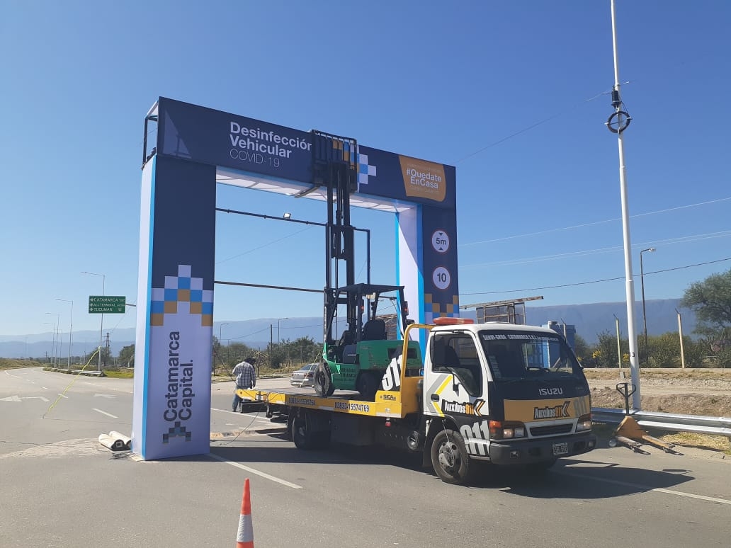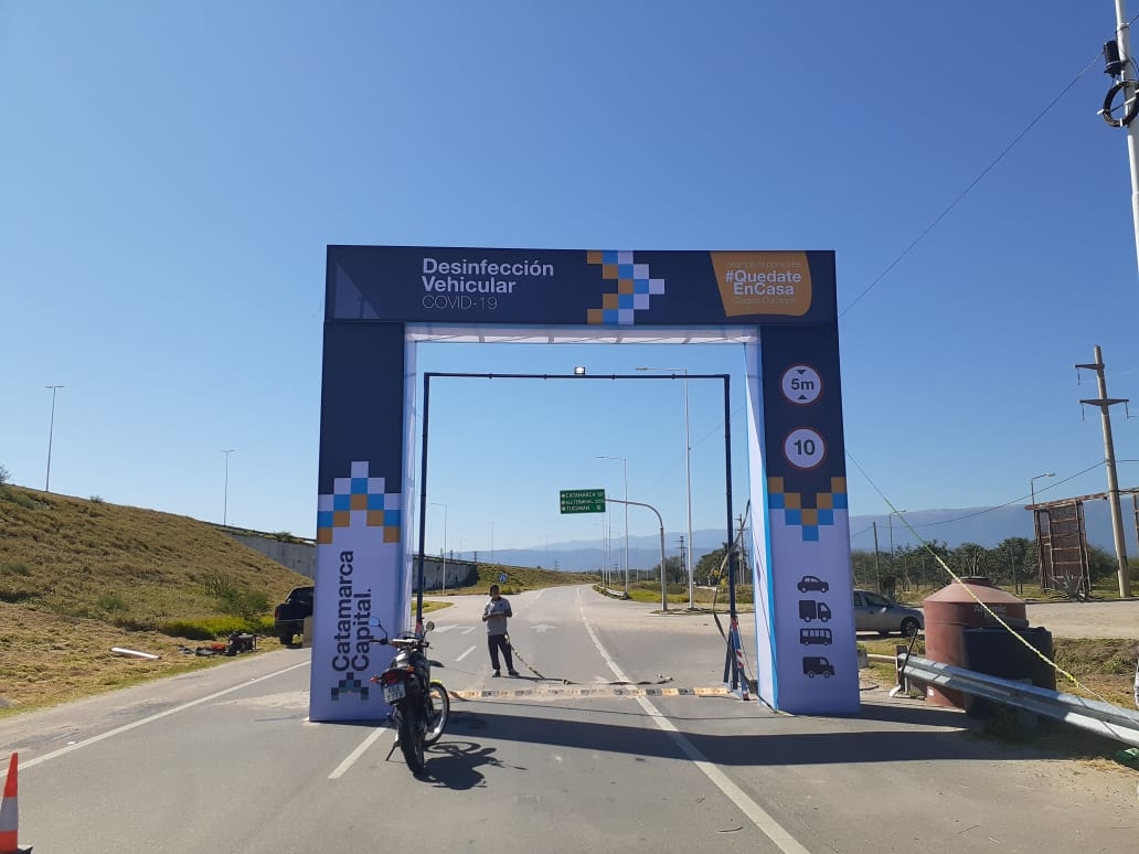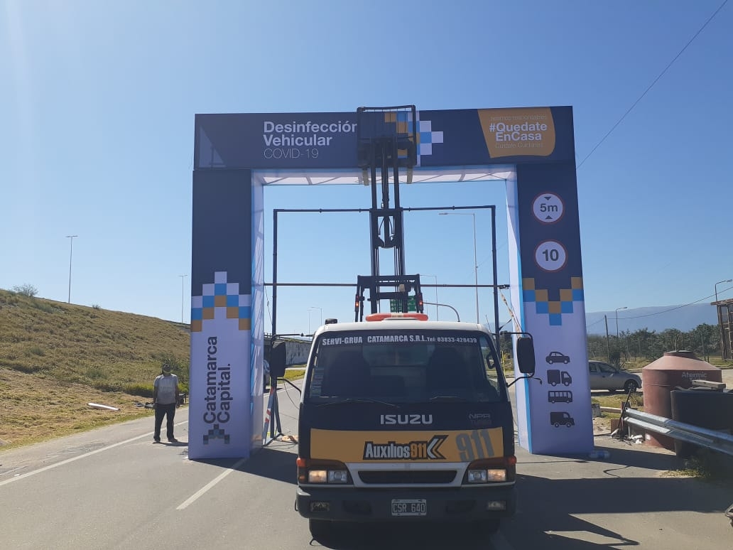 Se trata de un arco de desinfección de cinco metros de alto por cinco metros de ancho que tiene integrado un sistema de aspersores y bombas que disparan una solución clorada para la desinfección de vehículos. La intención es que todos los vehículos que quieran ingresar a la Capital pasen por el arco y de esa manera lograr la desinfección. También, los móviles oficiales de todas las dependencias del estado que presenten servicio en esta emergencia deberán pasar por el arco de desinfección.
