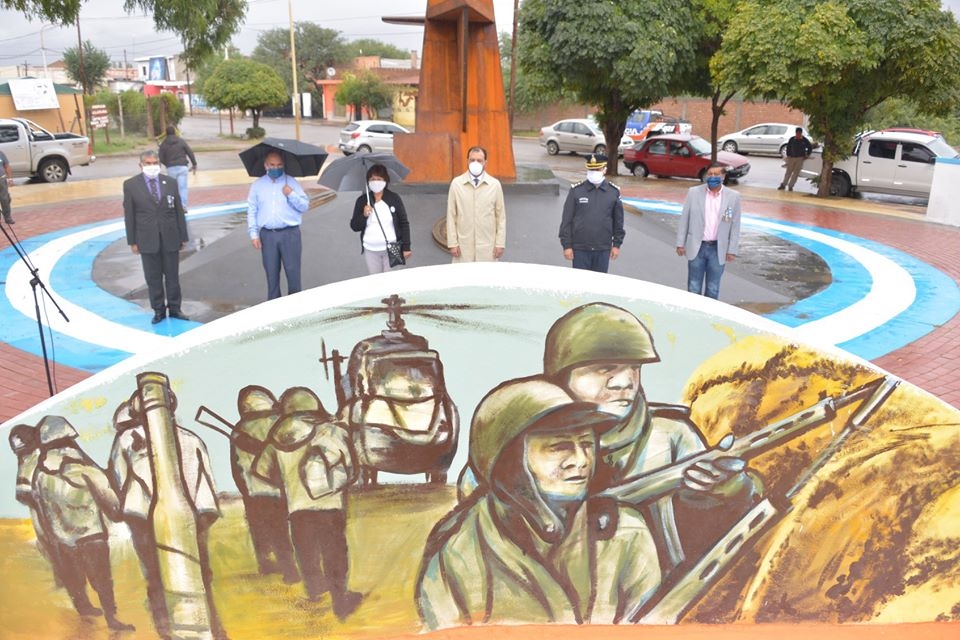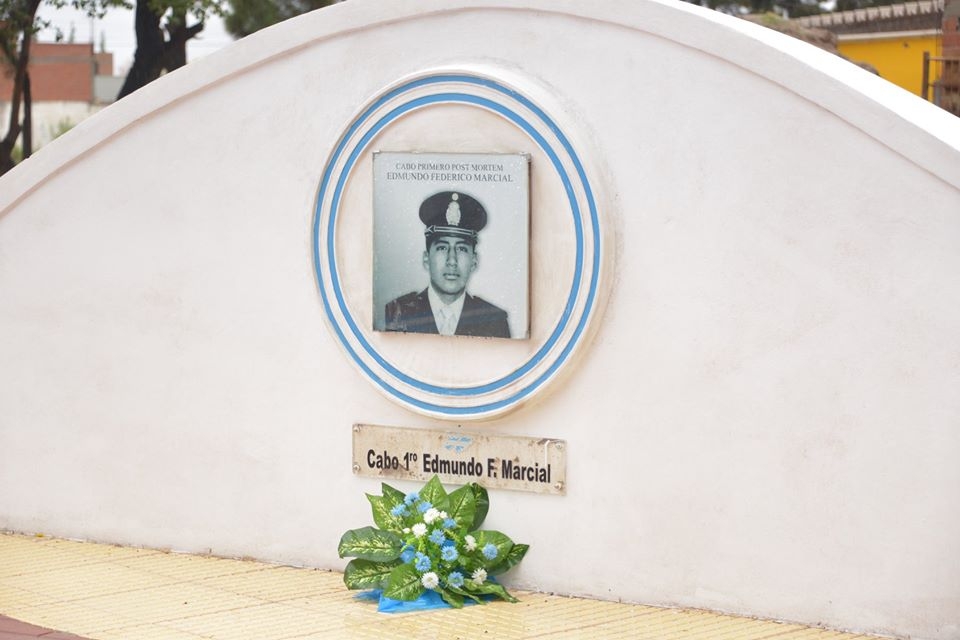 Estuvieron presentes junto al intendente, el secretario general del municipio, Antonio Camposano; el Comisario Sorialos, ex combatientes Armando Héctor Araoz, David Moya y Mirtha Marcial, hermana del Cabo. Allí, luego de los himnos, dejaron una ofrenda en Honor al Cabo Primero Federico Marcial.