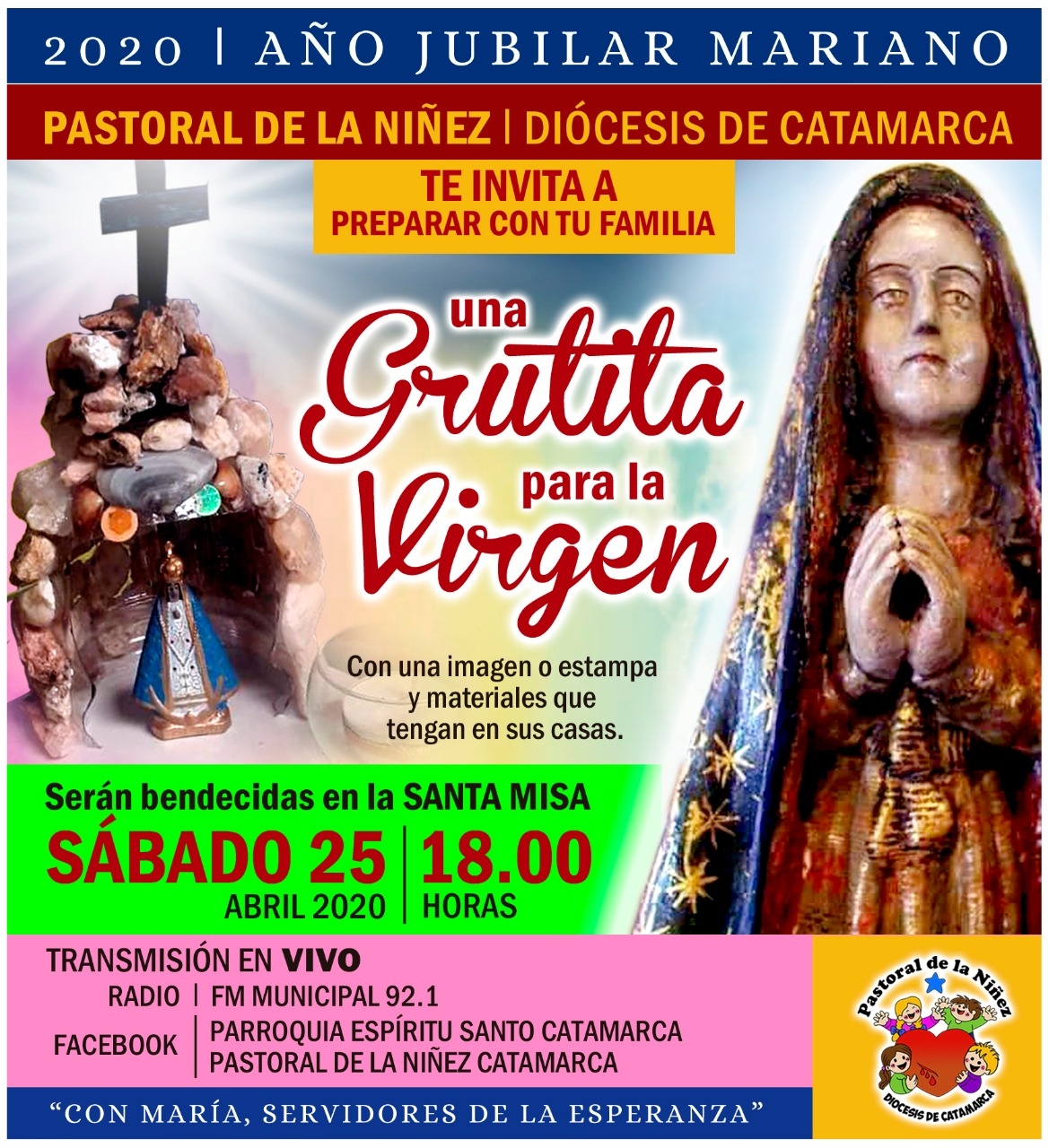 Dentro de las actividades por el Septenario en honor de Nuestra Madre del Valle, la Pastoral de la Niñez de Catamarca invita a todos los niños a preparar junto a sus familias una grutita para la Virgen, como regalo en el marco del 129° aniversario de su Coronación Pontificia, Año Jubilar Diocesano y Año Mariano Nacional por los 400 años de su presencia entre nosotros.