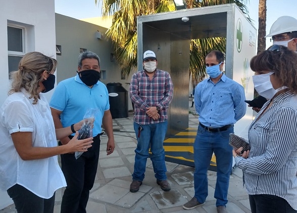 En su recorrido habitual por las obras del nuevo Hospital, que se llevan a cabo en el CIIC, el equipo de salud evaluó el funcionamiento de la primera cabina sanitizante totalmente construida y a instalar por PRODUCAT, dependiente del Ministerio de Infraestructura y Obras Civiles.