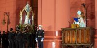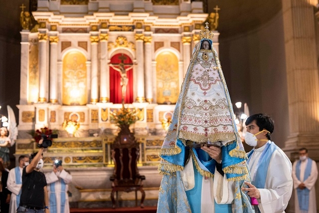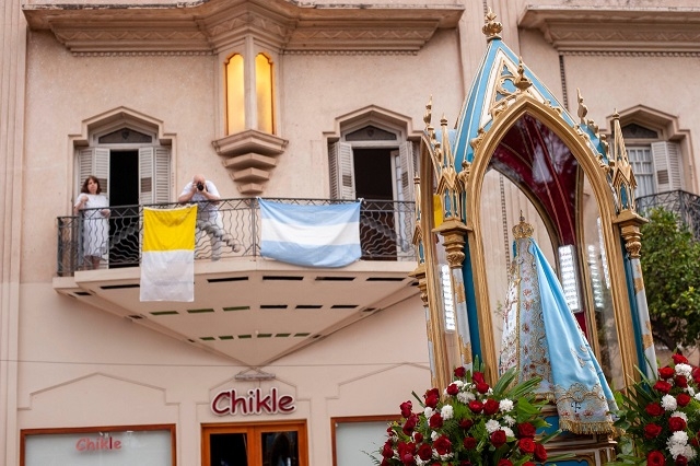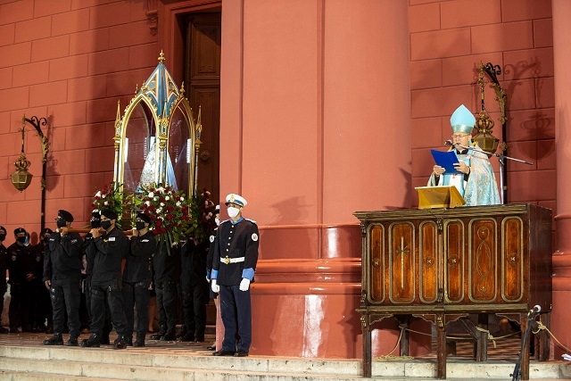 El canto preanunció el momento más esperado en todos los rincones del país. El redoblar de campanas de la Catedral acompañó su caminar por la nave central del templo hacia el atrio, llevada por primera vez por integrantes del Grupo Kuntur de la Policía de la Provincia. En cada casa, en cada lugar desde donde se seguía la transmisión, los corazones latieron con intensidad, se levantaron los pañuelos y las lágrimas rodaron por miles y miles de rostros, porque la Sagrada Imagen de Nuestra Madre del Valle salía desde el interior de su Santuario acompañada por el Obispo y sacerdotes.
