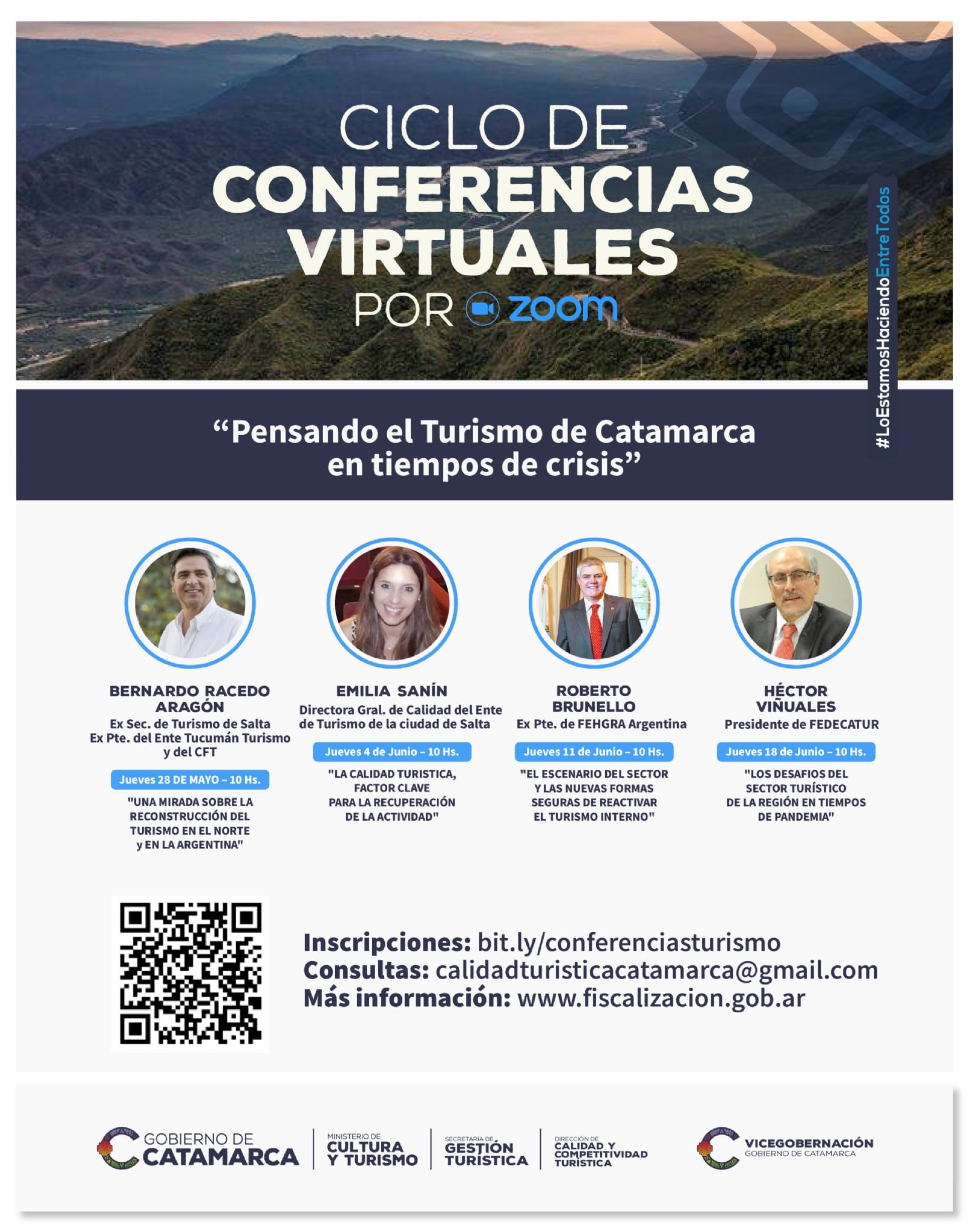 Organizado por el Ministerio de Cultura y Turismo de Catamarca, a través de la Secretaría de Gestión Turística, con la coordinación de la Dirección Provincial de Calidad y Competitividad Turística y el auspicio de la Vicegobernación, comenzará el próximo jueves 28 de mayo el ciclo de conferencias virtuales sobre turismo, denominado “PENSANDO EL TURISMO DE CATAMARCA EN TIEMPOS DE CRISIS”, el cual se encuentra dentro del Programa Integral de Capacitación Virtual.