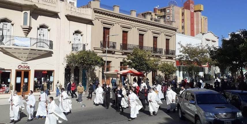 Un nutrido grupo de fieles se sumó a esta manifestación pública de fe alrededor de la plaza 25 de Mayo, principal paseo público de la ciudad. Todos los hicieron manteniendo la distancia social y el uso del barbijo.