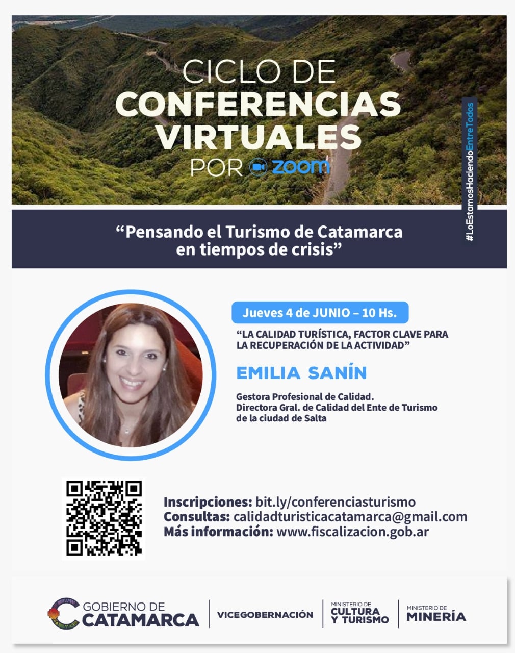 Este jueves 4 de junio, continuará desde las 10 de la mañana, el ciclo de conferencias virtuales sobre turismo, denominado “PENSANDO EL TURISMO DE CATAMARCA EN TIEMPOS DE CRISIS”, el cual se encuentra dentro del Programa Integral de Capacitación Virtual.