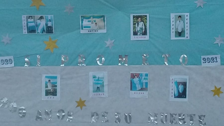 En cuanto a la formalidad de la "promesa de lealtad", al no poder concretarse mediante actos presenciales, sobre la pared de la escuela pegaron fotos de todos los alumnos del 4to. Grado, identificandolos con sus nombres, y la frase "Sí prometo..." en letras de papel brillante, color plateado, el mismo que utilizaron para rendir homenaje al Gral. Belgrano, creador de la Bandera Nacional "a 200 años de su muerte".