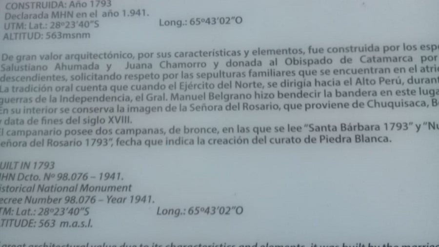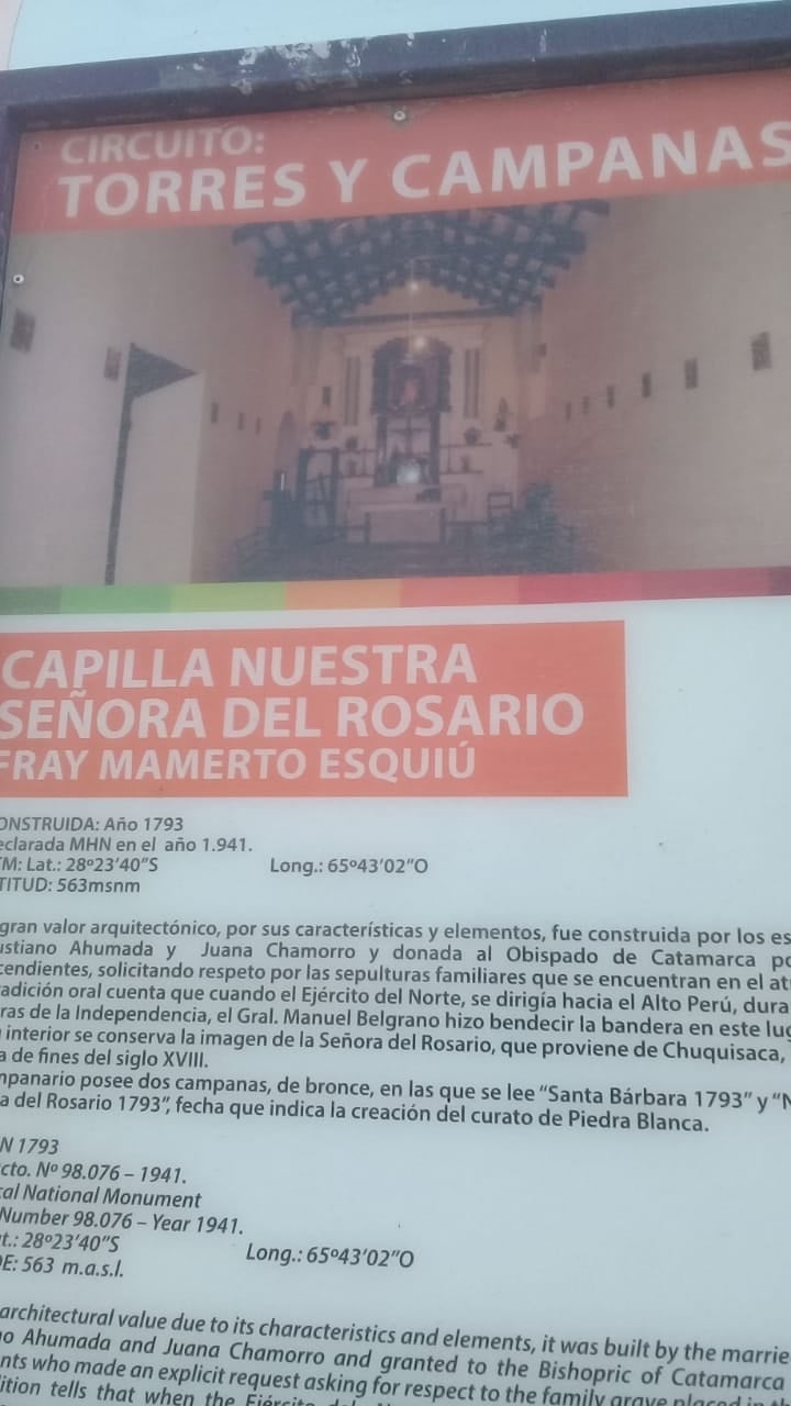 Gershani Oviedo alude en principio a la síntesis histórica anotada en el acceso a la Capilla de "Nuestra Señora del Rosario", en Piedra Blanca, departamento Fray Mamerto Esquiú, donde se indica que "la tradición oral cuenta que cuando el Ejército del Norte se dirigía hacia el Alto Perú, durante las guerras de la Independencia, el Gral. Manuel Belgrano hizo bendecir la bandera en este lugar".