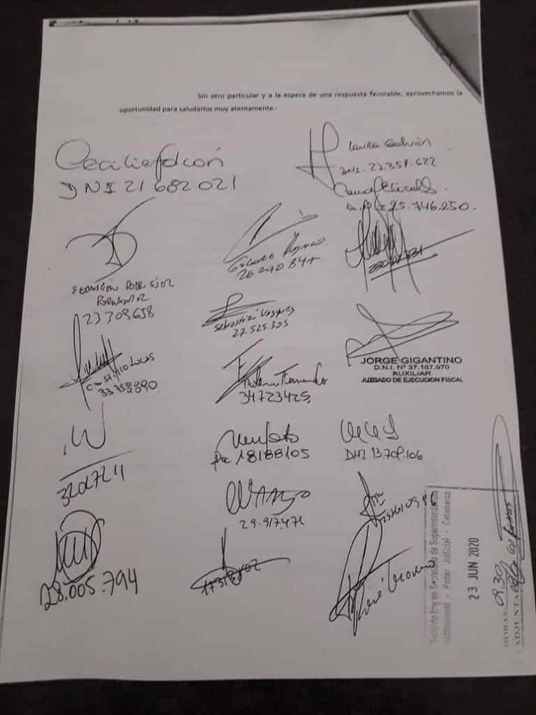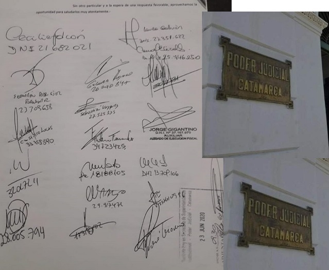 El texto, ingresado a las 9.30 hs. de hoy, por la Secretaría de Superintendencia del Poder Judicial de Catamarca, fue acompañado por otros ocho folios, adjuntando las firmas de trabajadores judiciales de las distintas dependencias tribunalicias de esta Capital.