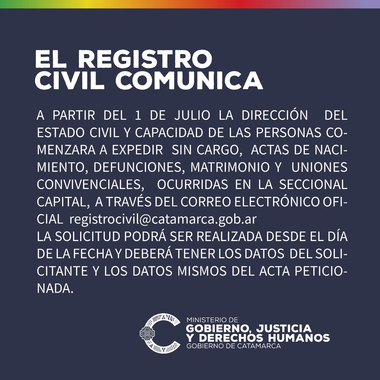 La Dirección del Estado Civil y Capacidad de las Personas, dependiente del Ministerio de Gobierno, Justicia y Derechos Humanos de la Provincia, informa que a partir del 1 de julio se expedirán gratuitamente y a través del correo electrónico digital ([email protected]) partidas de nacimiento, fallecimiento, matrimonio y uniones convivenciales ocurridas en la seccional de Capital.