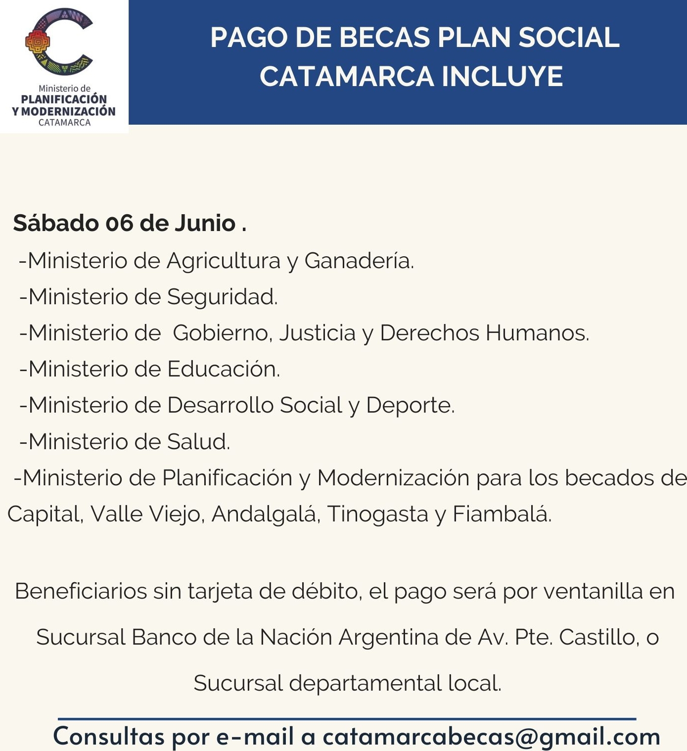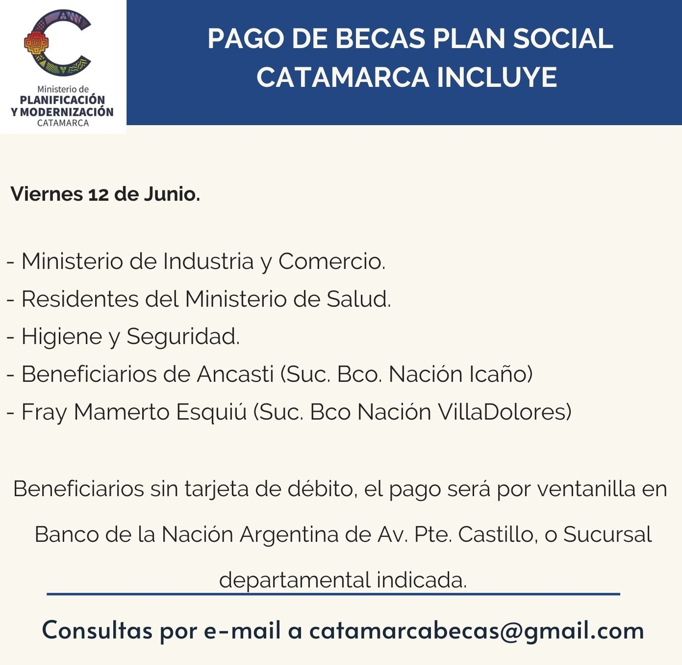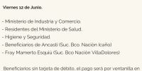 Beneficiarios sin tarjeta de débito el pago se realizará por ventanilla en la sucursal BNA de Av. Presidente Castillo de 8 a 13 o en sucursal correspondiente a su departamento, Ancasti en Sucursal Icaño y Fray Mamerto Esquiú Sucursal de Villa Dolores.
