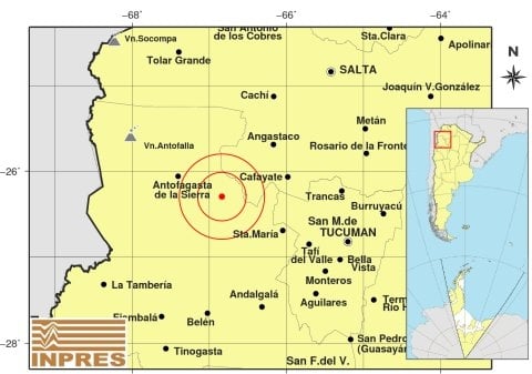 Epicentro: 173 km al O de San Miguel De Tucumán; 217 km al SO de Salta; 63 km al SE de Antofagasta De La Sierra -26.297 (lat) -66.837 (long)