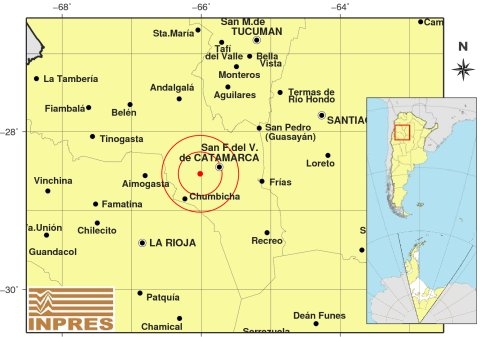 Epicentro: 29 km al O de San F. Del Valle De Catamarca; 126 km al NE de La Rioja; 41 km al NE de Chumbicha -28.537 (lat) -66.015 (long)