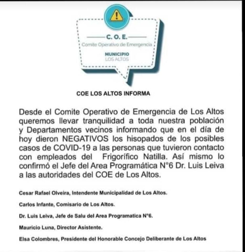 Se trata de las personas que tuvieron contacto con los trabajadores del frigorífico Natilla en su paso por Los Altos.